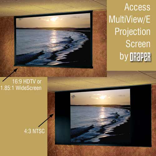 A ceiling-recessed motorized screen and independently motorized masking system provides dual format projection—all in a ceiling-recessed Access case. Select a projection screen in HDTV or WideScreen format up to 10' wide. A flat black mask on a second motor-in-roller converts the screen to NTSC video format by masking the right and left sides of the viewing surface. The height of the viewing surface remains constant. Motor-in-roller is mounted on special vibration insulators so operating noise is dramatically reduced. The reflective surface is laminated to a woven textile base and hangs suitably flat because of the stability of the material and the weight of the bottom dowel.