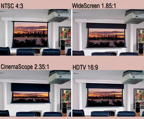 to provide four different projection formats at the touch of a button, all in a ceiling-recessed Access case. A flat black mask on a second motor-in-roller converts the projection screen to your choice of four formats: 1:1.33 NTSC, 1:1.78 HDTV, 1:1.85 WideScreen and 1:2.35 CinemaScope.