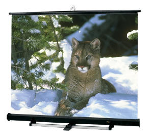 Large portable, spring-roller operated projection screen designed to fit in the optional floor stand. Simple in design and rugged in construction. It is housed in a steel case finished in black with matching heavy-gauge endcaps.
