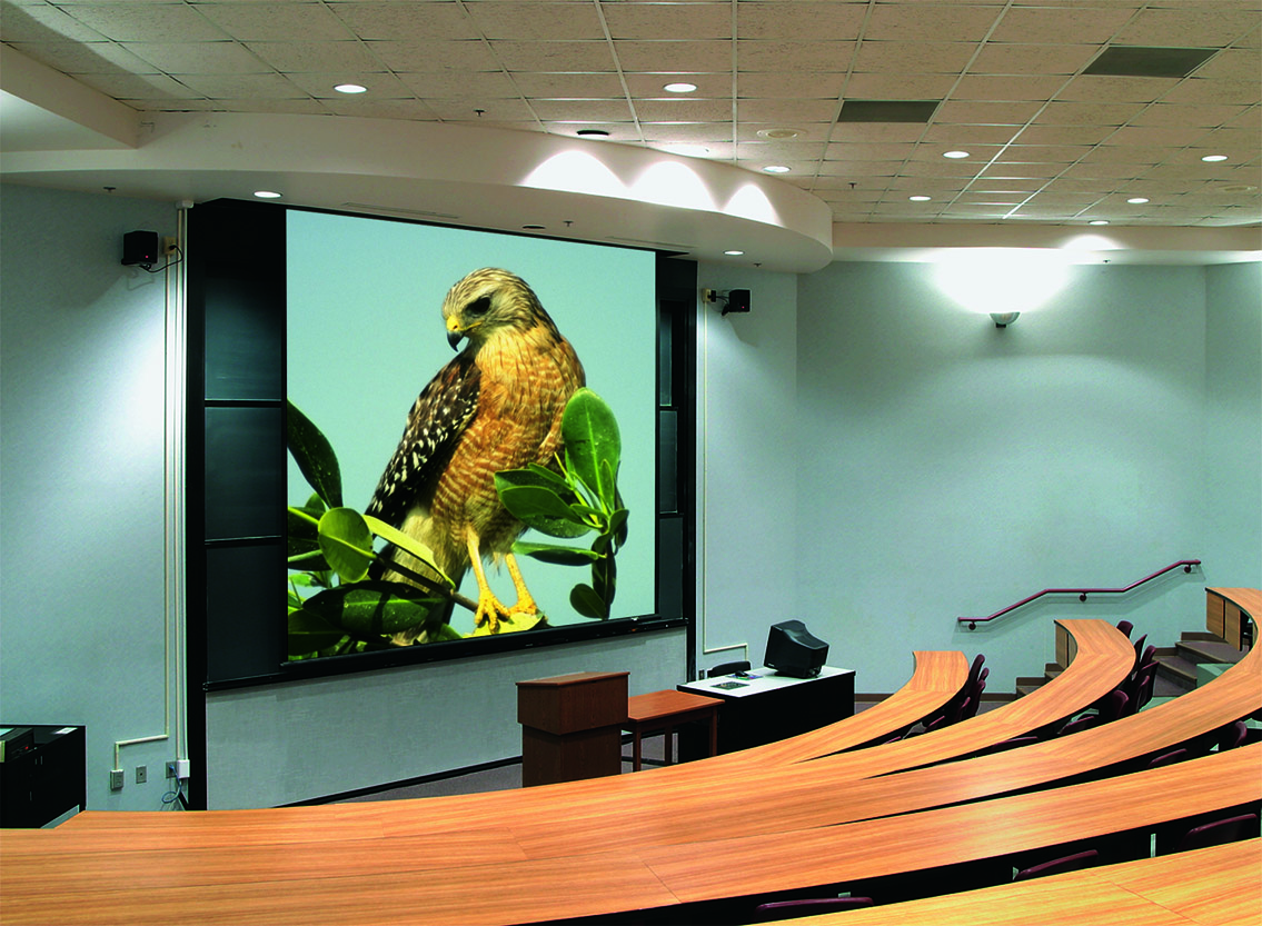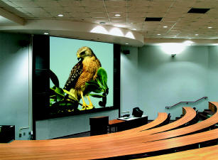 It's heavy-duty so it is ideal for auditoriums and lecture halls, hospitals, hotels, churches and other large venues. All wood case may be recessed in the ceiling or painted to match its surroundings. End-mounted motor sits on rubber vibration insulators, minimizing friction and noise. Viewing surface can be lowered to any position at the touch of a switch. Can be installed above the ceiling line.