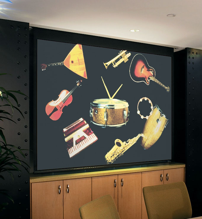 Ceiling-recessed, motorized screen with automatic screen closure. Ideal for boardrooms and meeting rooms. Its independently motorized aluminum ceiling closure disappears into the case when the screen is lowered, for a perfectly unobstructed view. Hinges are completely concealed, and the closure is supported for its entire length—no sag is possible. Motor-in-roller is mounted on special vibration insulators so operating noise is dramatically reduced. The reflective surface is laminated to a woven textile base and hangs suitably flat because of the stability of the material and the weight of the bottom dowel.