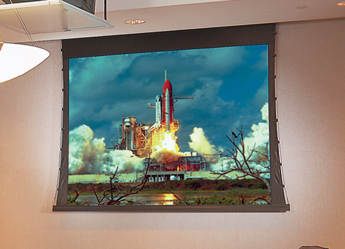 Ceiling-recessed, motorized screen with automatic screen closure. Ideal for boardrooms and meeting rooms. Its independently motorized aluminum ceiling closure disappears into the case when the screen is lowered, for a perfectly unobstructed view. Hinges are completely concealed, and the closure is supported for its entire length—no sag is possible. Motor-in-roller is mounted on special vibration insulators so operating noise is dramatically reduced. The screen surface consists of a reflective vinyl with no textile backing, and is tab-tensioned for improved image clarity. The surface is stretched flat, resulting in better picture quality.