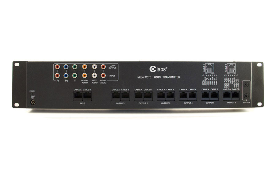 Six Output HD Component + Audio CAT5 Distribution Distribute high definition component or composite video and digital or left and right audio over extended distances using CAT5 wire.