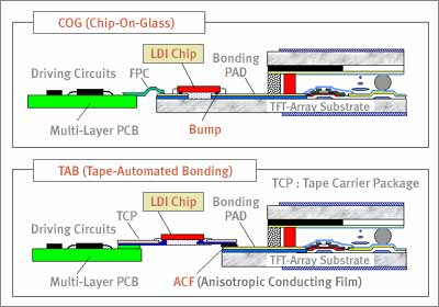 the chip-on-glass (COG) method, in which LDI chips are mounted directly on