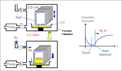 the empty cells are filled with liquid crystal material by vacuum injection.