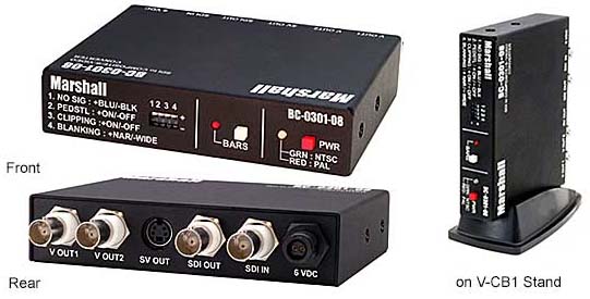 Marshall's Low-cost BC-0301-08 digital to analog module can be configured for use in desktop or studio rack mount applications. The unit features 2 simultaneous Composite Video and S-Video D to A (10 bit processing) conversion. The unit also includes a built in Color Bar