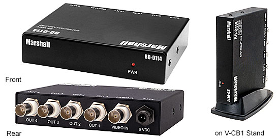 Marshall's BD-0114 Distribution Amplifier is for use in a wide range of applications. Designed for high quality and critical video applications, this 1 x 4 Video distribution amplifier features signal bandwidth up to 300 MHz. Three of these modules can be used for Y-Pr-Pb (High Definition SMPTE-274), RGB or YUV component analog signal distribution. All Processing and Distribution modules include power supply and owners manual. An optional base holder (V-CB1) is available for use in desktop applications.