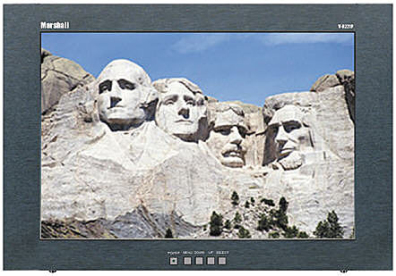Marshall V-R221P is a 22", high resolution (1600 × 1024) widescreen LCD panel capable of producing nearly 17 million different colors. Inputs include NTSC/PAL auto recognition composite video, S-video, analog RGB, TV tuner and WSXGA. Among the many on-screen features that this screen offers are; saturation, contrast, brightness. hue, horizontal and vertical positioning, color temperature and 4:3 to 16:9 ratio selection. This panel is built into an enclosure constructed of aluminum and steel with a professional black finish. Unit comes complete with remote control, power supply and owners manual.