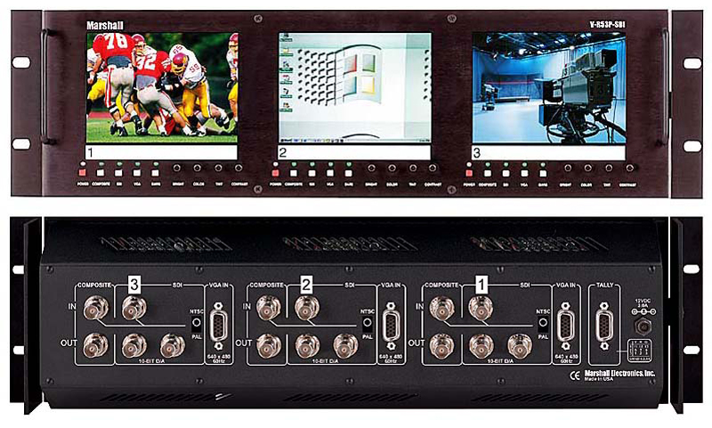 Marshall V-R53P-SDI is a rack mountable unit that has three independently controlled 5" active matrix LCD panels with active loop through feature. These 5” panels have 960 x 234 pixels producing a true high resolution image. Each monitor has a composite video, SDI, and a VGA input.