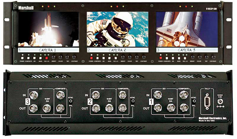 The Marshall V-R63P-SDI is a rack mountable unit that has three independently controlled 5.8" active matrix LCD panels with active loop through feature. These 16:9 high-resolution panels have a pixel count of 1200 x 234, and are rated at a very bright 350 candle luminance. Each panel has an SDI and a composite video input with a NTSC/PAL switch on the back.