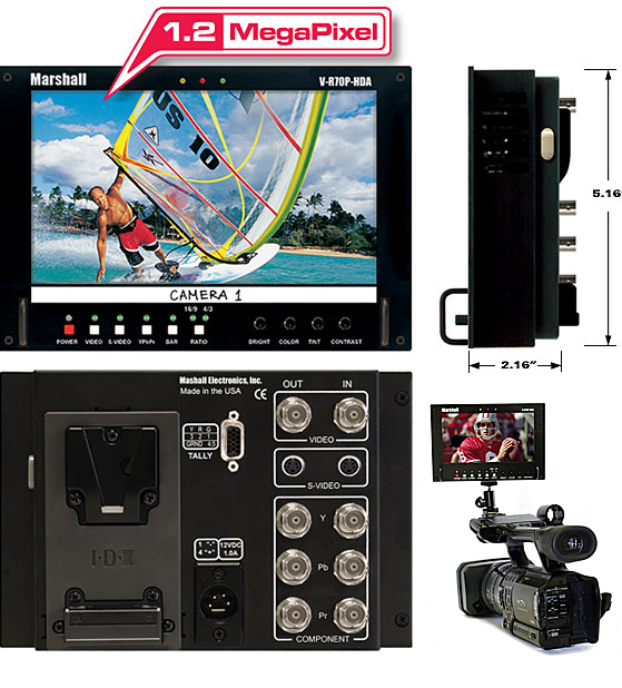 The Marshall V-R70P-HDA features our completely Digital TFT-Megapixel high resolution LCD screen with 1.2 million pixels, V-Mount battery adapter, 4 pin XLR power jack, and optical grade polycarbonate screen protection. Analog signals are digitized using an advanced 10 bit process with 4x over sampling and adaptive 5 line comb filter plus exacting color space conversion. Video is scaled to fit on screen in the highest resolution using a state of the art LSI that incorporates 4 x 4 pixel interpolation with precision Gamma correction to product the best images available.