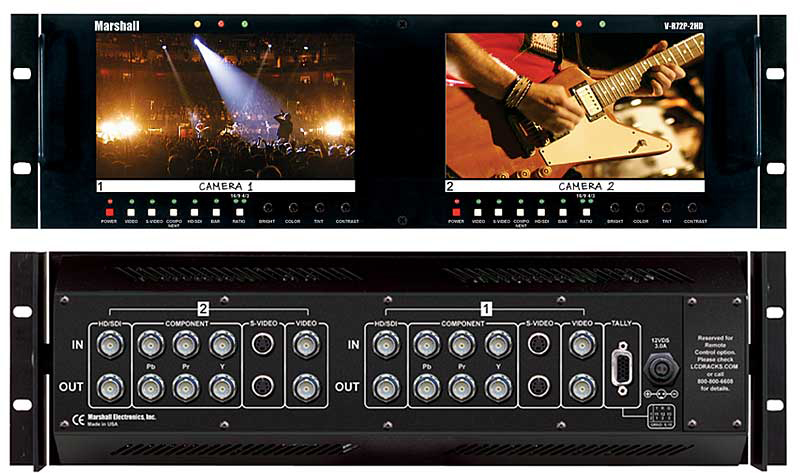 The Marshall Rack mounted and tiltable V-R72P-2HD represents leading edge technology in LCD/TFT imaging for broadcast and professional video applications featuring High Resolution, megapixel, TFT screens with completely digital signal processing. All SMPTE/ITU video standards and signal types are accepted and displayed on each screen of this model.
