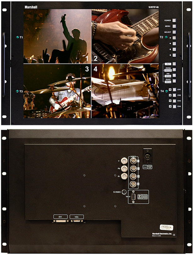 The V-R171P-4A from Marshall is a 17-inch LCD rack mounted unit that features a built-in Quad Splitter with Sequential Switcher. This high resolution