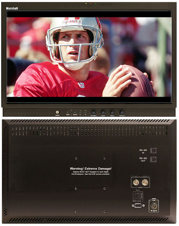 Marshall Electronics introduces the industry's first full lineup of In-Monitor Displays. The new V-R261-IMD-HDSDI 26" LCD monitor is a cost-effective "all-in-one" solution for post production houses, broadcasters, and mobile units. This fully-integrated approach eliminates the need for additional or separate Under Monitor Displays and allows UMD information and tallies to be displayed directly within a Marshall flat panel monitor, while saving precious rack space. A variety of features are readily available including on-screen Video Time Code, three-color "Soft" Tallies, and Audio Presence Indicator.