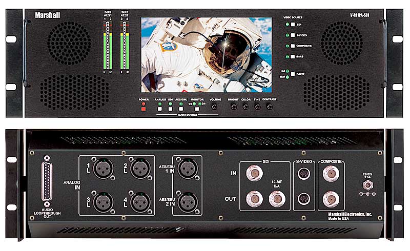 Marshall V-R71PA-SDI is loaded with features and flexibility. This unit accepts SDI, S-Video, and composite video sources with loop through in a 16:9 or 4:3 ratio. Two stereo pairs of audio may be inputted via 1 SDI embedded, or 2 AES/EBU, or 4 balanced XLR inputs. Simultaneous visual monitoring of up to 4 audio channels is obtained using a high-resolution LED bar display, while one selectable pair of audio is monitored via 2-way full range stereo speakers.