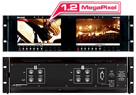 Marshall Rack mounted and tiltable V-R72P-AFHD represents leading edge technology in LCD imaging for broadcast and professional video applications featuring High Resolution, megapixel, TFT screens with completely digital signal processing. All SMPTE/ITU video standards and signal types are accepted and displayed on each screen of this model.