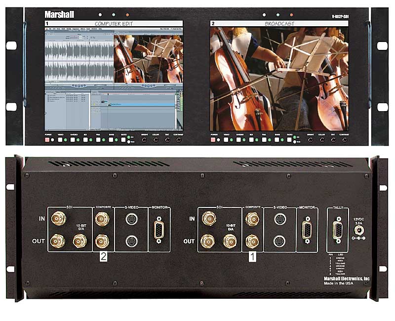 The Marshall V-R82P-SDI is a rack mountable unit that has two 8.4" active matrix LCD panels. These panels have 800 x 600 pixels making them true high-resolution screens with a brightness of 350 candle luminance. Each panel has a composite video, SDI, S-Video and VGA input with active loop through feature, and auto recognition for NTSC or PAL. For added flexibility, an independent 3 color tally system is provided for each panel. Each of the two screens have individual front mounted selector buttons with color, tint, brightness and contrast controls. The unit includes power supply, and fits into any standard EIA 19" rack, at 4U high.