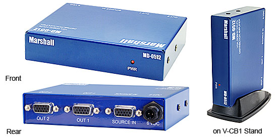 Marshall MD-0512-DA is a multiformat 1 x 2 distribution amplifier, with signal bandwidth up to 350 MHz. This module can be used with VGA, SVGA, XGA, UXGA signals. An optional HD15 to 5 BNC cable (RGB-5HD15-X) can be used for RGBHV, Y-Pr-Pb, YUV, RGB, and composite signals. Supports screen formats up to 1920 x 1080. An optional base holder (V-CB1) and BNC Breakout Cables (RGB-5HD15-X) are available for use in desktop applications. The unit includes power supply (Model V-PS6-1.2A), Users Guide, Rack Mount Brackets and Desktop footpads.