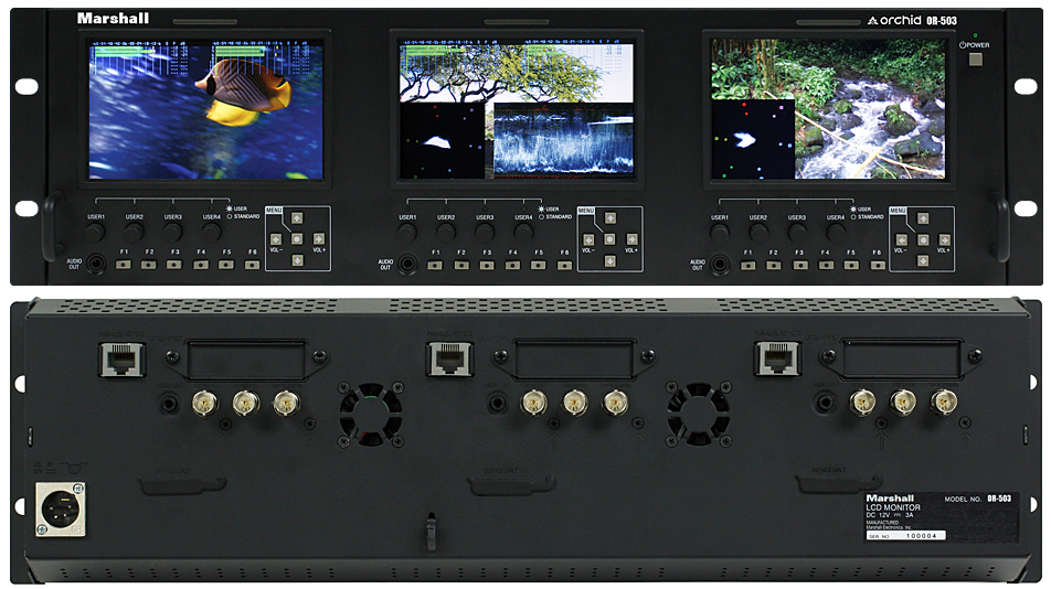 The Marshall OR-503 Triple 5 inch ORCHID™ rack mount monitor has all the features that customers have asked for and more. The OR-503 is 3RU and has 6 user-assignable function keys as well as 4 user-assignable rotary encoders. This unit also utilizes a 5 button menu system. The built-in waveform monitor (which includes adjustable White and Black clip level indicators) can be displayed in three different aspect ratios including Full Screen. The built-in Vectorscope displays in full color and can also be displayed in three different ratios. The Vectorscope has adjustable gain from 1x to 5x. All screens are color matched at the factory and can be auto-adjusted in the field using an optional color probe system. The OR-503 will de-embed and display up to 16 channels of audio and allow the user to monitor any two channels at once through the headphone jack or rear line output jack. The 64-segment tri-color bar graph meters have user-adjustable reference levels. The OR-503 comes standard with auto-sensing HDSDI inputs, re-clocked outputs, and open modular slots for additional inputs in the future.