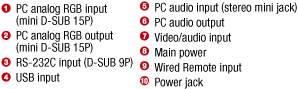 data source ports, USB terminal and a remote controller with a laser pointer are