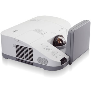 The NEC U310W, an ultra short throw projector that delivers an extremely short throw distance solution for education (including interactive whiteboards) and corporate applications. With its ability to be mounted to the wall above the screen, this model completely eliminates shadows and glare typically found with standard projection systems. Additional features for the 3D Ready U310W projector include DLP and DLP Link technologies from Texas Instruments and wide connectivity (HDMI and dual computer inputs).