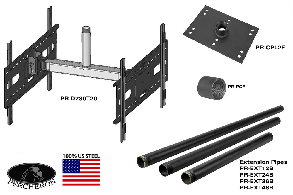 Percheron offers several packages for Dual Medium / Large TV Ceiling Mounting with 20" Panel Separation. All of the packages come with the Percheron PR-CPL2F Large Ceiling Mounting Plate along with the Percheron PR-D730T20 Double Ceiling TV Mount. Depending on the package selected, we offer different extension pipes and couplings.