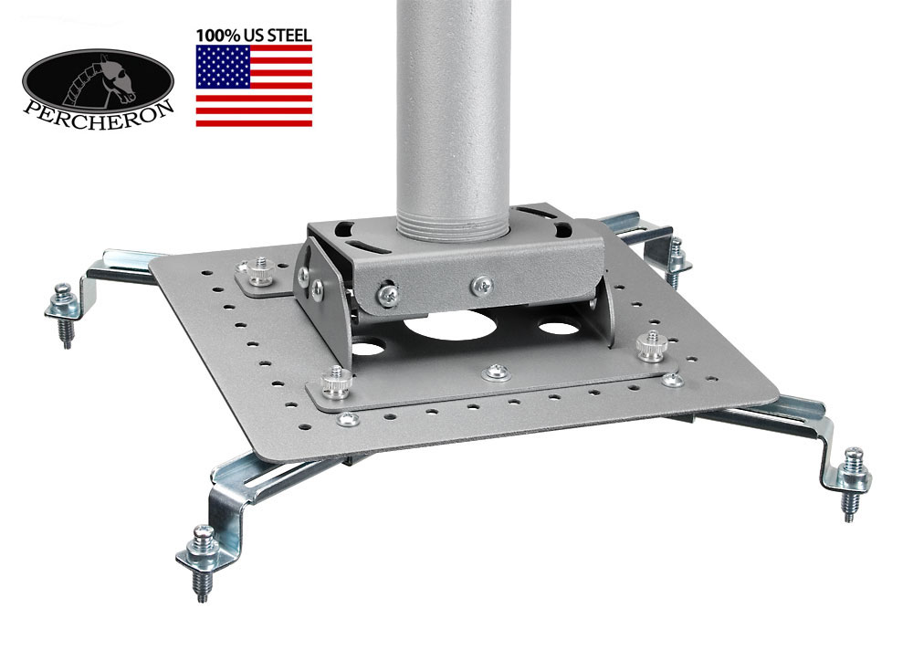 UNIVERSAL PROJECTOR MOUNT. Adjustable arms fit most projectors. Max arm spread 16.625" across multilateral. Roll +/- 4° Pitch +/- 26° Swivel 360°. Color: SILVER. Can be flush mounted to ceiling and receives a 1-½" N.P.T. tube (sold separately). 50 lbs Recommended Max Load. Can be flush mounted to ceiling and receives a 1-½" N.P.T. tube (sold separately). 50 lbs Recommended Max Load.
