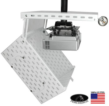 PROJECTOR SECURITY CAGE. Heavy gauge construction with security hex key screw hardware. Welded 1-½" coupling in two positions on the top plate; padlock security (inlcuded). Color: WHITE. Silver or Black available as special order item. Please call for details. Front and side openings provide optional mounting positions; Cable hole in top plate. Swing-down access to projector for easy maintenance and bulbs replacement. Ships fully assembled.
