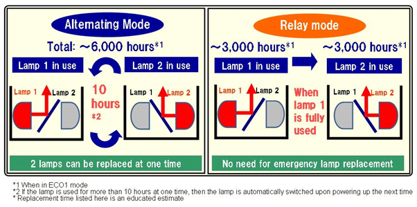 - `Relay Mode' uses one lamp to recommended lamp replacement time, then switches lamps
