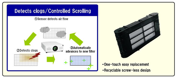 Along with the updates over the previous model in terms of higher brightness, the use of projectors is expanding in locations such as large halls and rooms with high ceilings and harder to reach projector settings. SANYO provides easier maintenance options for its projectors with this new solution for replacing lamps. SANYO already provides simple maintenance option such as the AMF cartridge-type filter system. With this latest feature, SANYO will continue to provide projectors with the simplest maintenance, filled with features, allowing a variety of projector settings to meet each individual need.