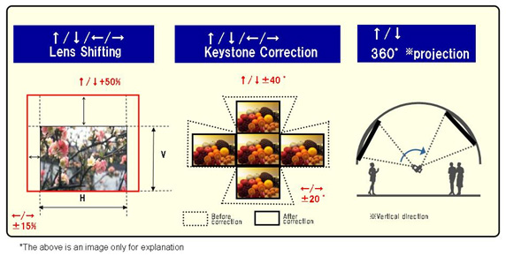 3. Vertical/Horizontal Lens Shifting & Keystone Correction / 360-degree*5 Projection: Installation in various places is possible