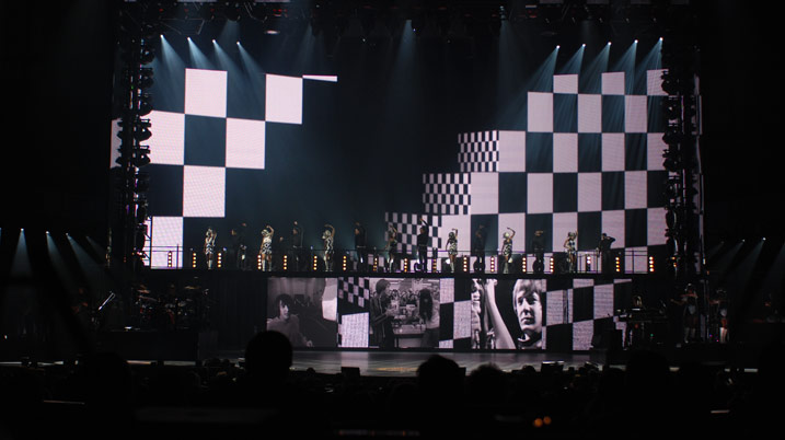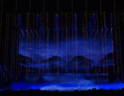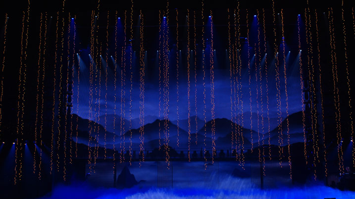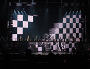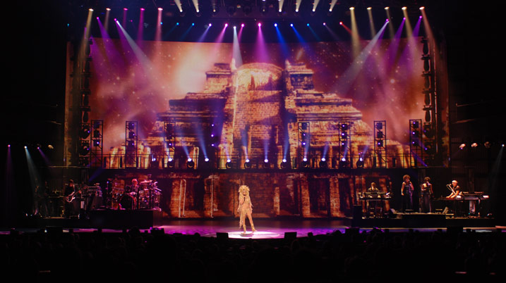 Throughout the Cher concert, an enormous 120 ft. by 40 ft. screen is utilized as a “curtain” that covers the entire stage, allowing for transitions and set changes to take place behind it. It displays content such as animation, images and old movies of Cher. It is fed by four Christie Roadie 25K projectors, two on each side of the stage, their images blended into a single, continuous image to cover the entire screen seamlessly.