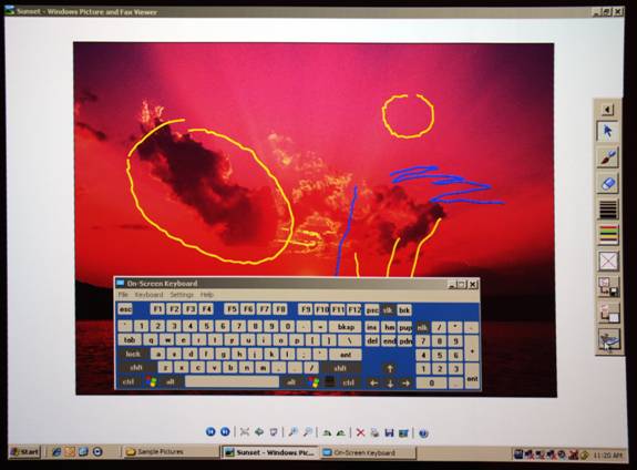 Windows sample picture showing the Light Pen software bar on the right, and yellow “pen” emphasizing activity of the bees.
