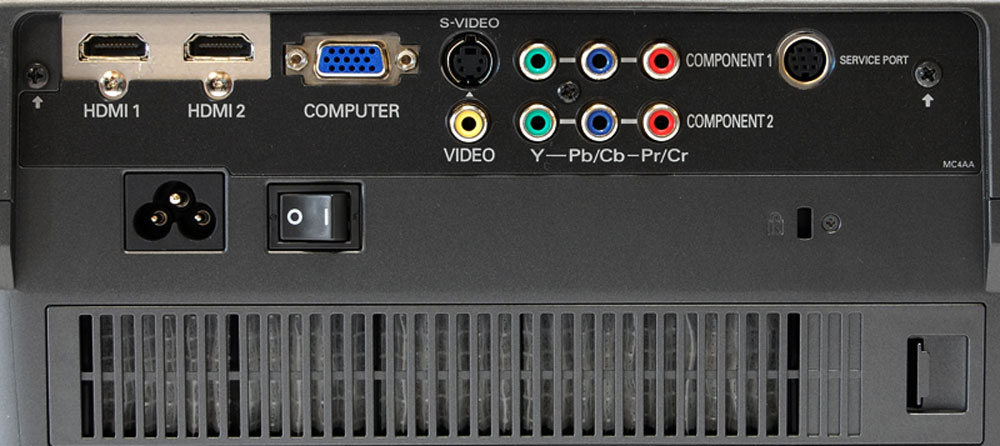 In terms of size and dimensions, both offer a modest, compact, and portable build. The Sanyo PLV-Z60 weighs in at just 11 pounds (4.9 kgs.), with dimensions of W x H x D: 15 x 5 x 12 inches or 38.1 x 12.7 x 30.5 centimeters. Flipside, the Epson 720 tips the scales at just 11.5 pounds (5.2 kgs.), with dimensions of W x H x D: 16 x 4.9 x 12.2 (not including lens protrusion of 1 and 5/8 of an inch) inches or 40.6 x 12.4 x 30.9 centimeters. While the PLV-Z60 is smaller, it’s by such a minuscule amount that for all intents and purposes, this is really just a push. In terms of the actual design and layout of both projectors, both feature rear inputs, two height adjustable legs up front, as well as console buttons on the top portion of the projector that include all the standards for power, menu, and input sources, though the Epson 720 also offers buttons for escape and aspect ratio. Additionally, both projectors naturally feature a lens to the right most side on the front of the projector, though this is also the point of departure. While the Sanyo lens is tucked in, flush against the projector, and features a motorized sliding lens cover, the lens on the 720 sticks out about 1 and 5/8 of an inch from the front of the projector and features a standard plastic lens cover. Further examination leads to pros and cons for both methods. While Sanyo scores safety points for having their lens tucked in, the automatic motorized lens door worries me in that there’s always the potential for it to breakdown or malfunction, leading to potentially expensive repair costs. With Epson, while the lens isn’t subject to malfunction in that regard, because the lens sticks out, there’s always the potential for a moment of clumsiness whereby the lens itself is exposed and subject to being damaged. But assuming you have your projector mounted (very likely considering this is designed as a home theater piece); you don’t really have the immediate access to accidentally damaging it, at which point the protruding lens is no longer an issue. Speaking of lenses, the Sanyo PLV-Z60 features a zoom lens with a ratio of 2.0:1, while the Epson 720 offers a slightly better zoom ratio of 2.1:1. In addition to the zoom, both lenses also offer focus rings, but where the rings on the Epson are easy to access because of the lens protrusion, they prove quite difficult to adjust on the Sanyo because they are flush against the projector and are surrounded by the projector chassis around it. While this can make for lens adjustment "fun" on the PLV-Z60, it’s certainly not the good kind. Some other notable design differences between the two LCD projectors are that the air vent on the PLV-Z60 is on the left-hand side of the projector, while the one for the Epson 720 is just directly across from the lens. Another one is that the manual horizontal and vertical lens shift half-rings on the PLV-Z60 are on the right-hand side of the projector, while the Epson offers its manual horizontal and vertical half-rings on the top of the projector. Let’s now compare the input connections on both of these projectors.