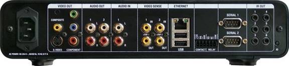 Pictured above is the HC-300. This is the entry lever controller. As you can see from the picture of the back it has 6 direct IR outputs that you can double up on with dual emitters. Dual serial connectors, a relay, contact connection, 10/100 Ethernet connection so you can connect this to a router or the internet and program it or access a computer on the network and use its saved mp3 files to play audio throughout the house. Video connections and twin USB ports that you can connect USB thumb drives or a USB hard drive and have your system access music from there. This all for not much more then a top of the line Harmony remote, but with the ability for much more expansion and control over your house.