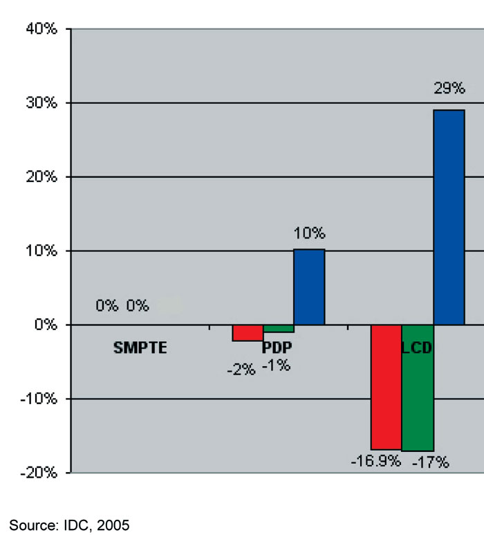 The graphic below (left), courtesy of IDC, illustrates in chart form how much more color accurate plasma (PDP) displays are as compared to LCD, by virtue of this RGB SMPTE color pattern comparison. Ideally, the closer to 0% percent you are, the more accurate the color. Because the human eye is less sensitive to blue color frequencies, those numbers are less significant, but in the red and green spectrum, you can clearly see how much more spot-on plasma is. The chart to the right illustrates the superior color range that plasma (yellow triangle) has over LCD (blue triangle).